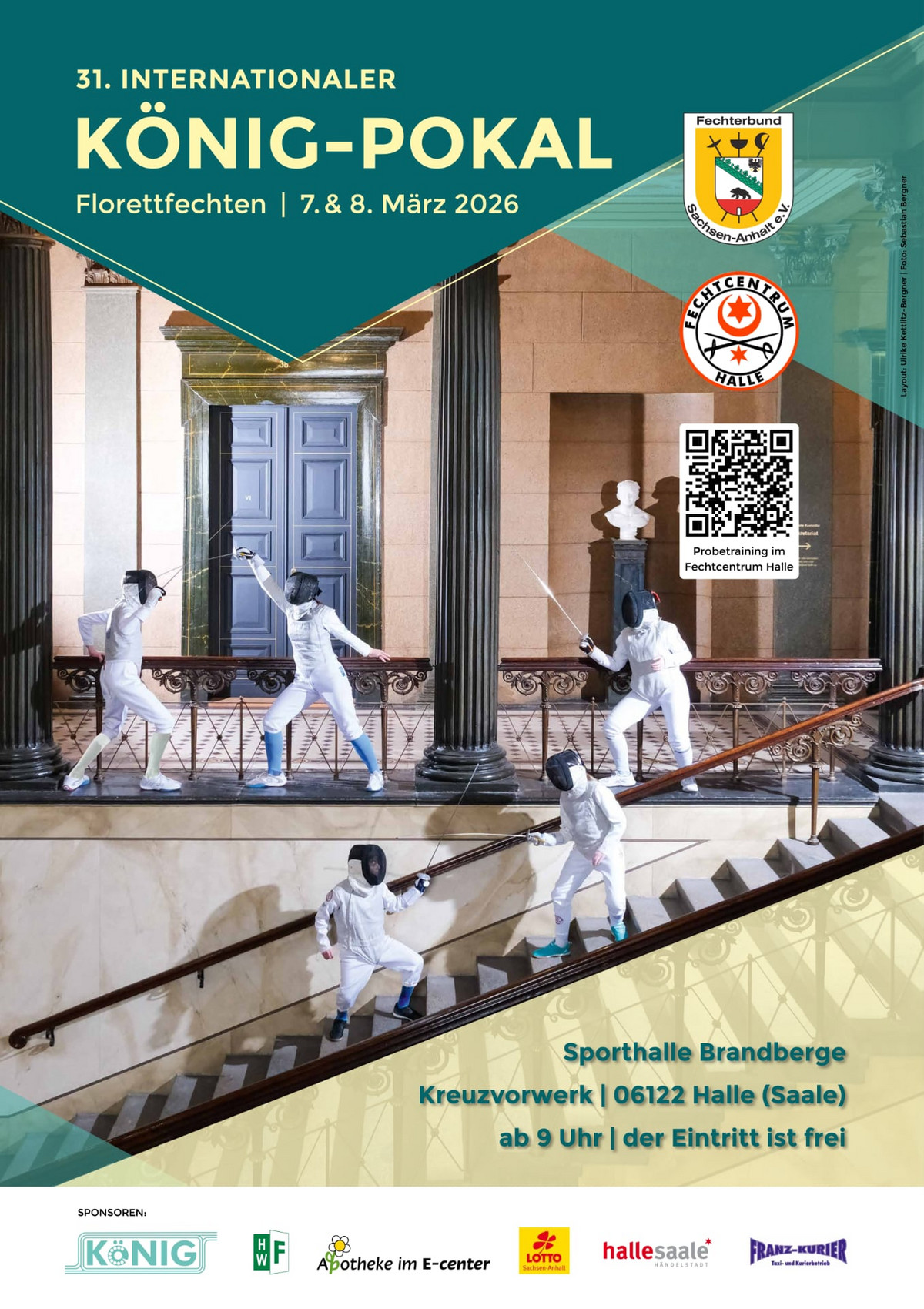 Am 07. und 08. März 2026 findet in der Sporthalle Brandberge in Halle-Kröllwitz der 31. Internationale KÖNIG-Pokal im Florettfechten (Wertungsturnier für die U-15 Turnierserie DFB Florett) statt. Der Fechterbund Sachsen-Anhalt und das Fechtcentrum Halle freuen sich, auch in diesem Jahr dieses Turnier im Damen- und Herrenflorett für die Altersklassen U15–U17 organisieren zu dürfen.
